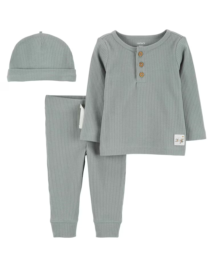 O Conjunto longo bebê 2 peças e touca canelado verde | Carter’s é ideal para os dias mais amenos e esbanjam charme e fofura. Composto por uma camiseta de manga longa, calça com cós elástico e acompanha touca. Perfeito para o cotidiano dos papais e mamães pois os itens combinam perfeitamente entre si e também podem compor outros diversos looks. Seu bebê ficará confortável e estiloso, invista!
