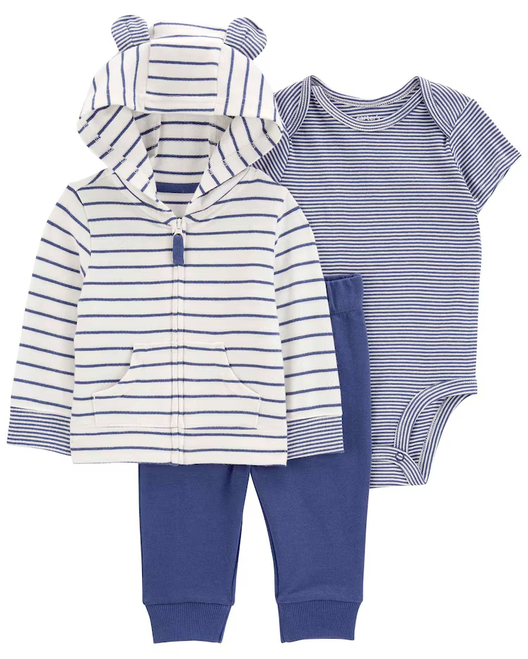 Pensado especialmente para dias mais gelados, o Conjunto longo bebê 3 peças listrado com capuz multicor | Carter’s é a pedida ideal para deixar seu bebê bem aquecido. O conjunto conta com 1 body com estampa listrada, 1 calça com cós elástico e uma uma blusa com mangas longas, abertura frontal por zíper e capuz com orelhinhas. Super aconchegante e quentinho, o conjunto vai proteger o seu bebê e ele ainda vai ficar uma gracinha!