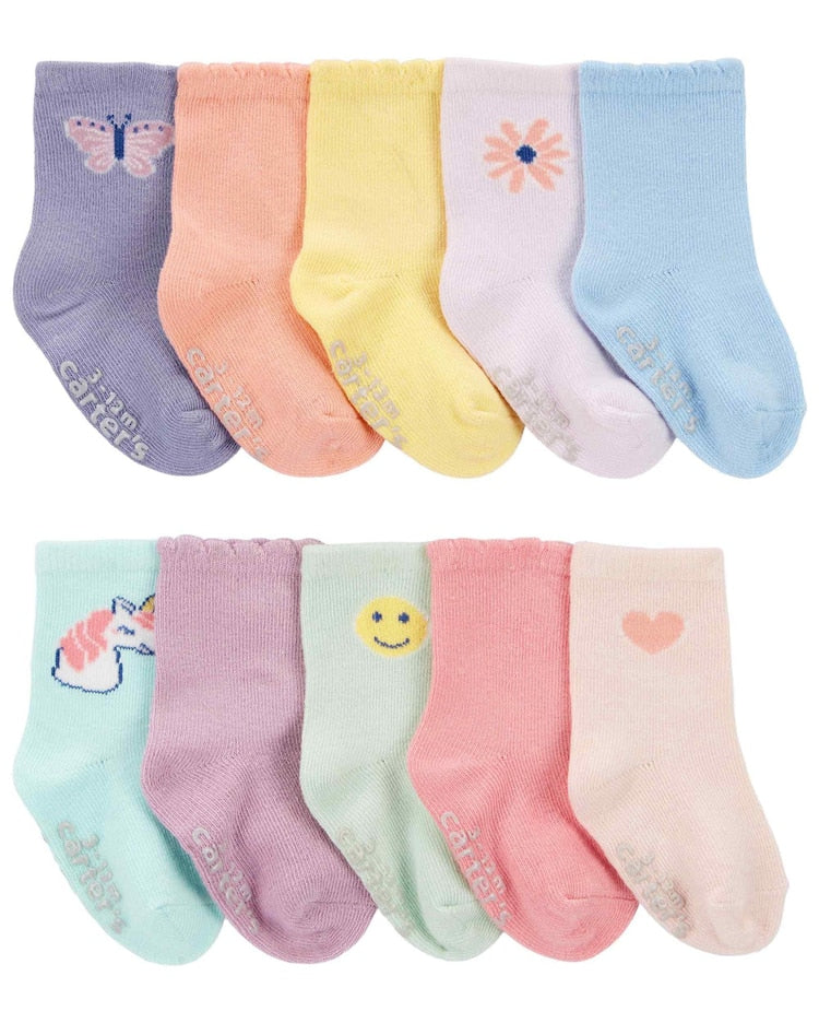 Deixe a sua baby mais fofinha e com os seus pezinhos protegidos com o Kit meia bebê 10 pares barra em ripple ícones multicor | Carter’s. Feito de algodão, poliéster e elastano, o kit conta com meias super confortáveis, com cores variadas, acabamento em ripple, estampa de ícones e traz um charminho único, perfeito para acompanhar essa fase fofinha de seu bem mais precioso. Aproveite!