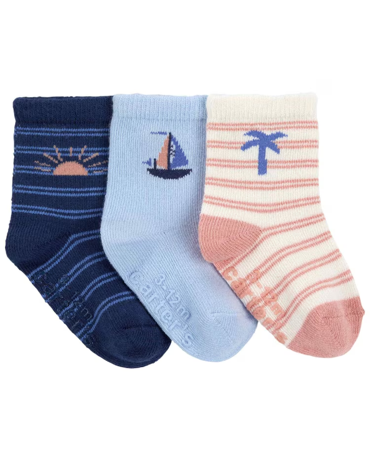 Deixe o seu baby mais fofinho e com os seus pezinhos protegidos com o Kit meia bebê 3 pares listras coqueiro multicor | Carter’s. Feito de algodão, poliéster e elastano, o kit conta com meias super confortáveis, punho canelado e seu charme está e seus detalhes: a estampa de coqueiro, sol e barco. Perfeitas para acompanhar essa fase fofinha de seu bem mais precioso. Aproveite!