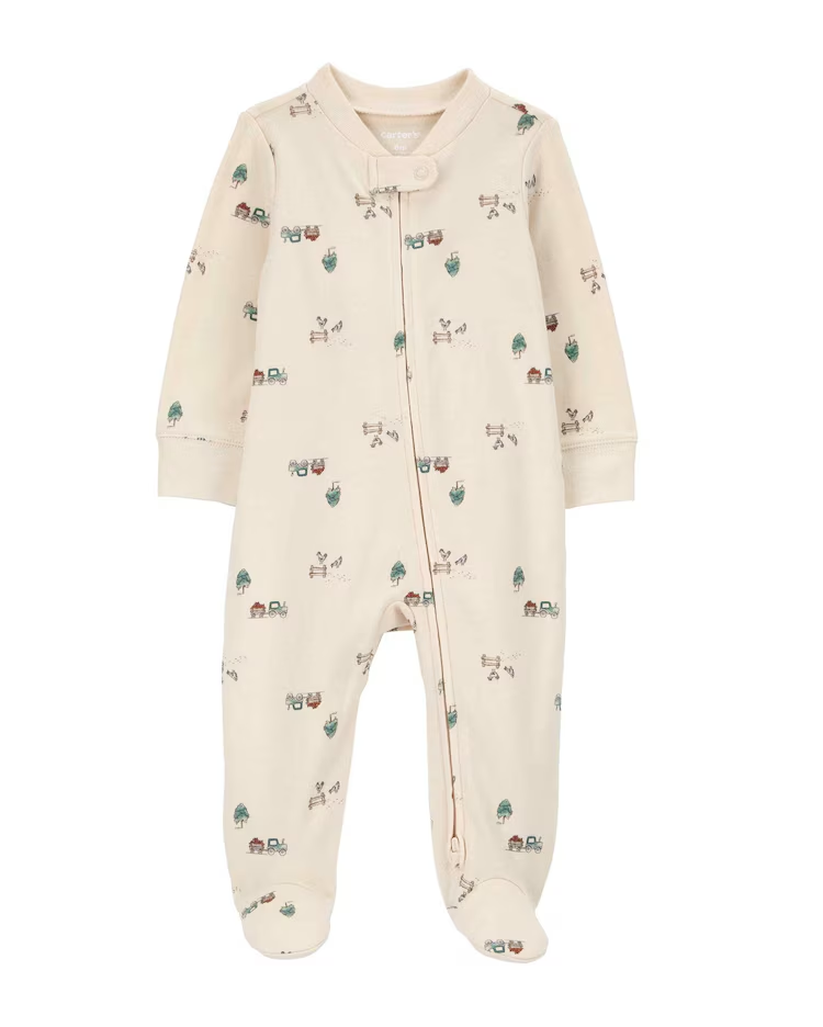 Deixe o seu baby ainda mais fofinho com o Macacão bebê com pezinho fazendinha bege | Carter’s. Feito de algodão, o macacão possui zíper inverso, martingale para proteger os dedos de seu baby, gola em ribana canelada e manga longas. A estampa de fazendinha é um detalhe a parte que traz ainda mais charminho para a produção de seu pequeno. Aposte!