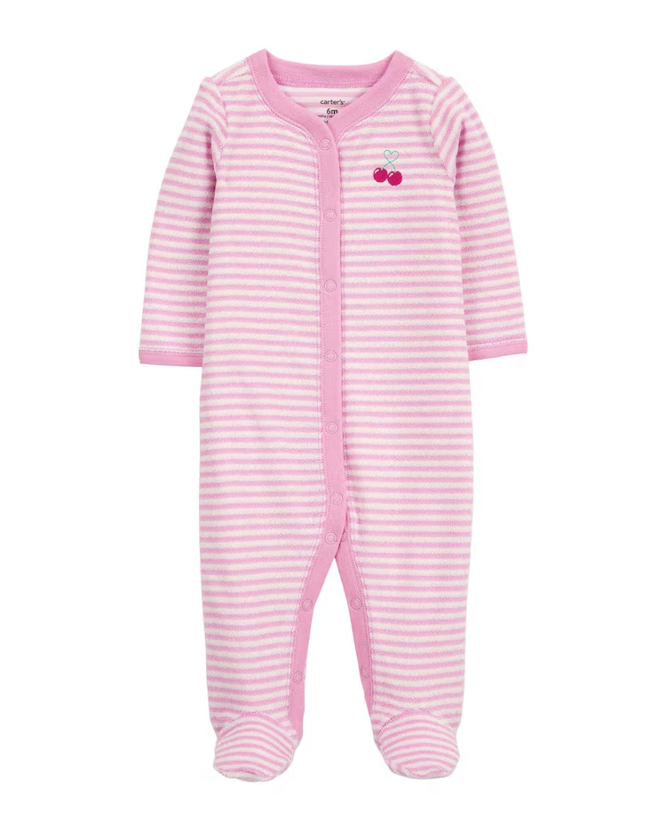 O Macacão bebê listrado com botões cereja rosa | Carter’s veio para deixar sua filha ainda mais fofinha e confortável. A peça é feita de algodão, conta com segurança de seu fechamento por botão, possui pezinho e seu charminho está na estampa listrada. Uma verdadeira fofura!