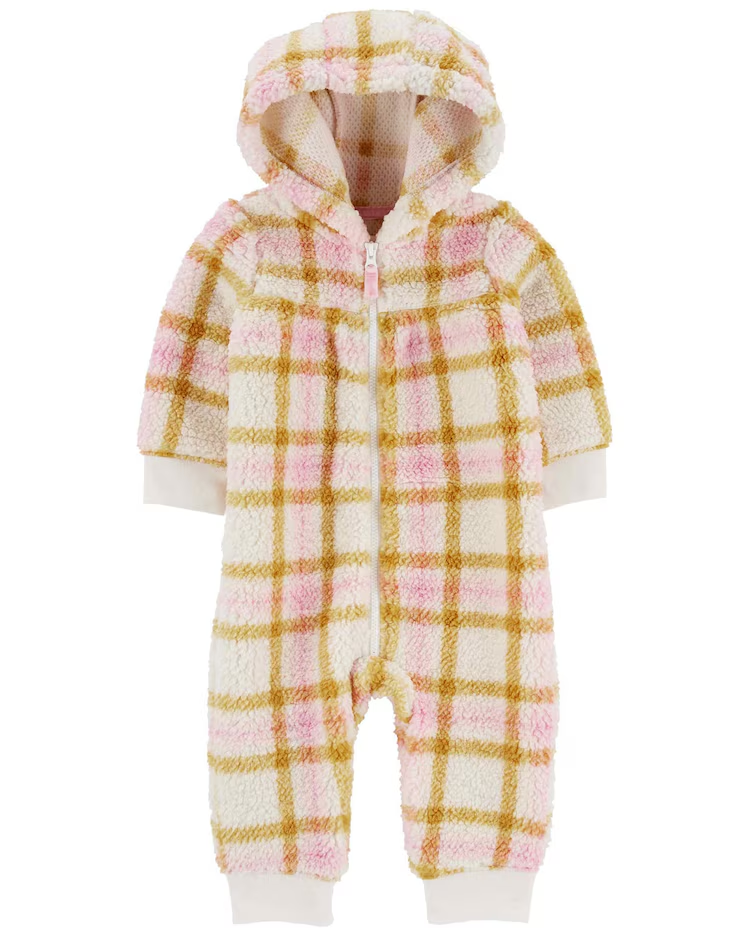 Após um dia de descobertas, o Macacão bebê peluciado com capuz xadrez bege | Carter’s aparece para proporcionar conforto e fofura para sua baby. A peça é feita de tecido peluciado sendo ideal para os dias mais frios. Conta com acabamento em ribana canelada, capuz, estampa xadrez, além do fechamento por zíper e mangas longas para proteger a sua pequenininha. Aposte!