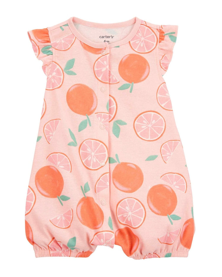 Perfeito para dias ensolarados e ideal para os papais de primeira viagem que buscam peças básicas, lindas e práticas para as trocas diárias, o Macaquinho bebê com elástico tangerinas rosa | Carter’s é perfeito para a sua baby. Feito de algodão, o macaquinho possui mangas curtas com babados, elástico na barra, abotoamento frontal e estampa super fofinha de tangerinas. Aproveite!