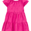 Vestido infantil evasê em laise rosa | Carter’s é super fofinho, confortável e charmoso para sua princesa usar em dias mais amenos. Feito de algodão, o vestido conta com modelagem evasê, gola redonda com elástico e seu detalhe em laise é super charmoso e traz ainda mais beleza para o seu bem mais precioso. Aproveite!